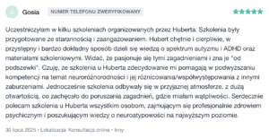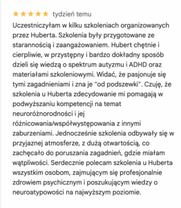 Mam na swoim koncie liczne szkolenia i kursy dla osób specjalistycznych – uczestniczyły w nich już setki osób, a moje szkolenia są cenione za praktyczne podejście, atmosferę zrozumienia i konkretne wskazówki do pracy. Jako szkoleniowiec cenię jasność przekazu, otwartość na pytania i realne wsparcie w rozwoju osób uczestniczących.